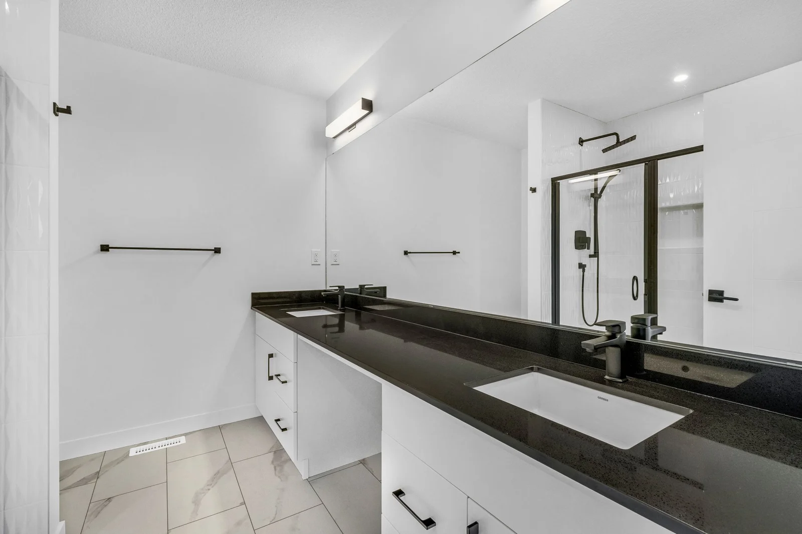 Upstairs, the spacious primary bedroom includes a walk-in closet and ensuite with a tiled shower and bench. The second-floor laundry, complete with a sink, adds convenience to daily routines. The 26’ deep double garage with a floor drain offers plenty of space for larger vehicles, making it ideal for year-round use.