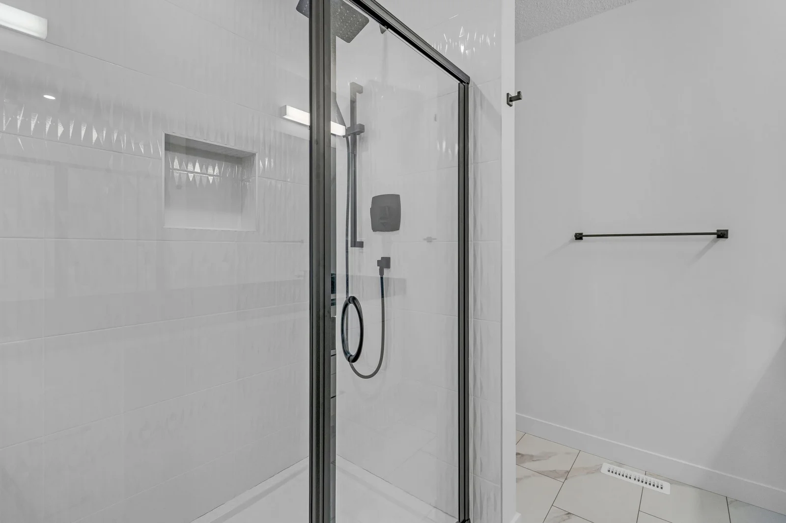 - tiled shower with bench