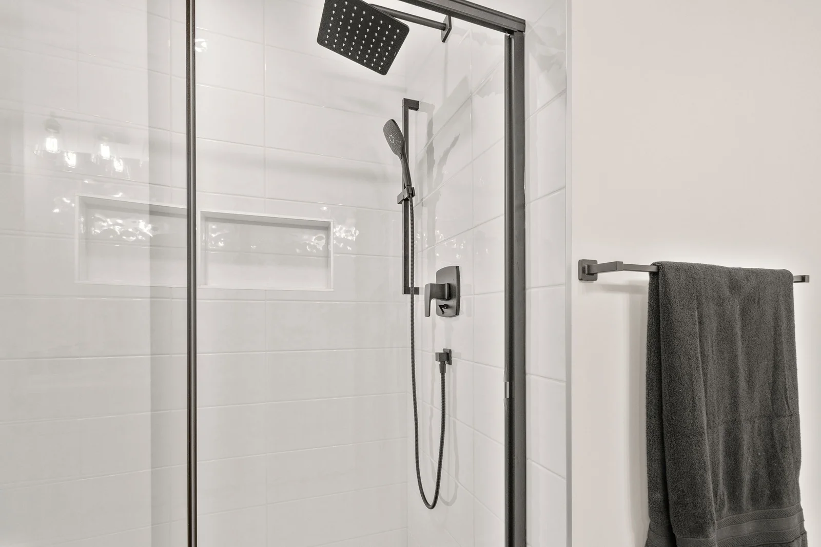 - tiled shower with bench
