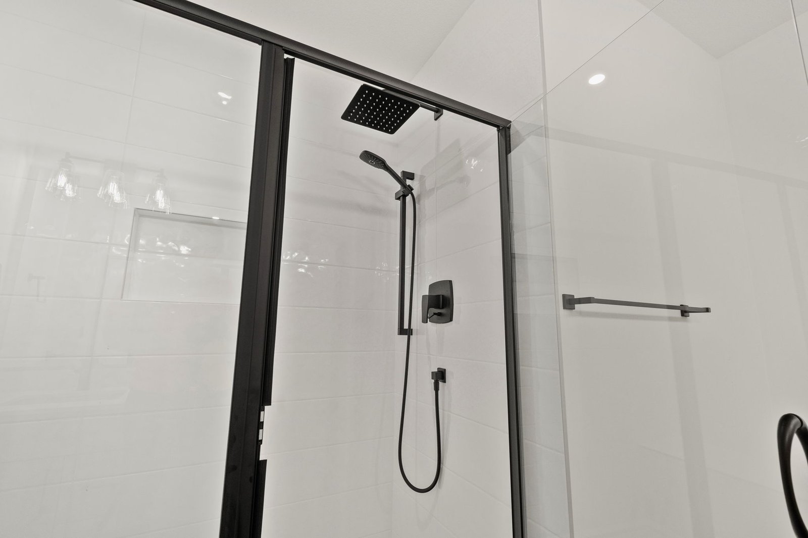 - tiled shower with bench